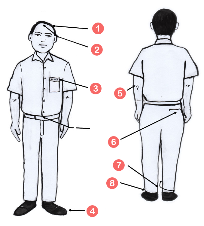 - කලිසමේ පසුපස සාක්කුව දකුණු පසින් තිබිය යුතුය.